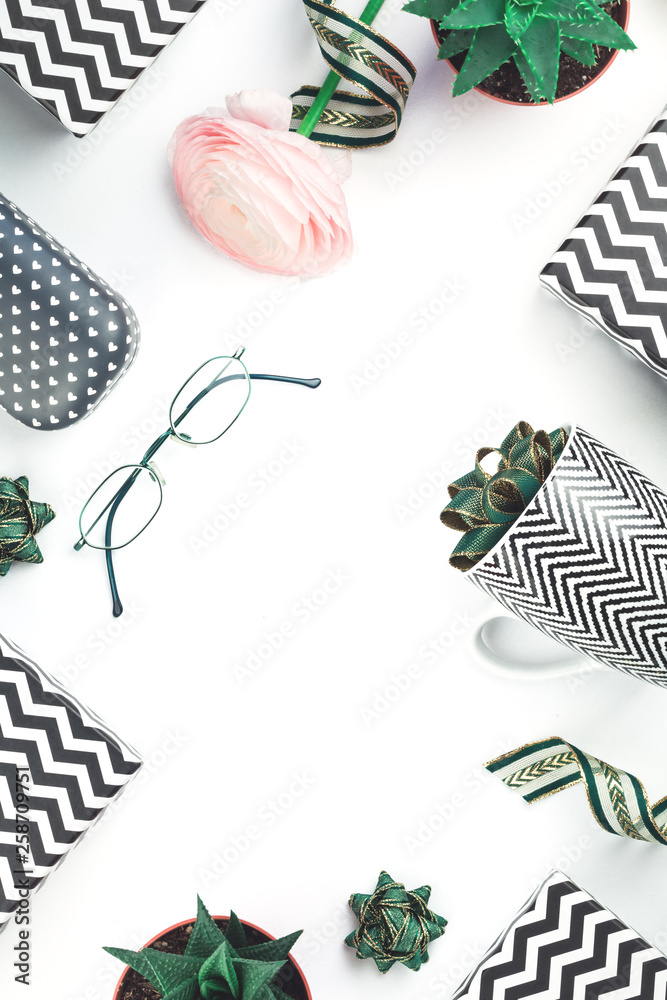 Black and white chevron gift boxes with green bows isolated on white with flower and coffee mug. Christmas, Valentine, thanksgiving celebration, black friday, shopping or blogger desk background
