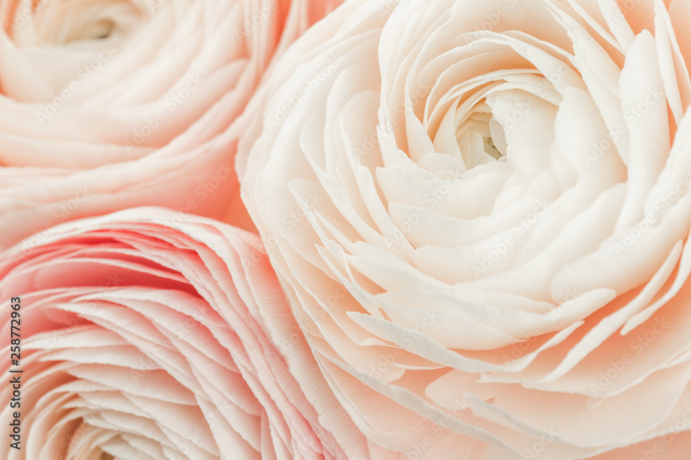 Pink colored feminine peony, rose or buttercup flowers with delicate layered petals close up. Natural textured background