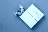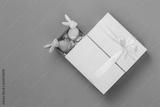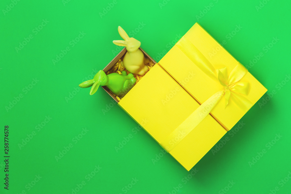 Yellow handmade bright gift box with a bow and two easter bunnies on green background, flat lay with copy space