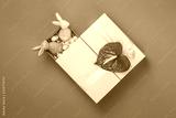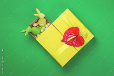Yellow handmade bright gift box with a bow and two easter bunnies and red flower on green background, flat lay with copy space
