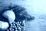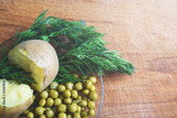 Boiled potatoes, green peas and greens on a wooden Board