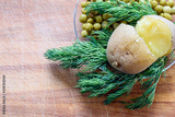 Boiled potatoes, green peas and dill greens on wooden background