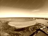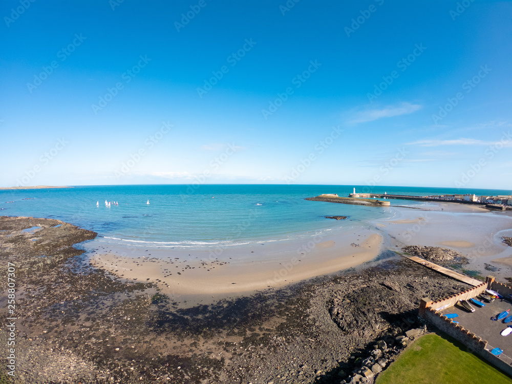 Aerial view of Beach and coast of Irish Sea in Donaghadee in Northern Ireland against clear blue sky.