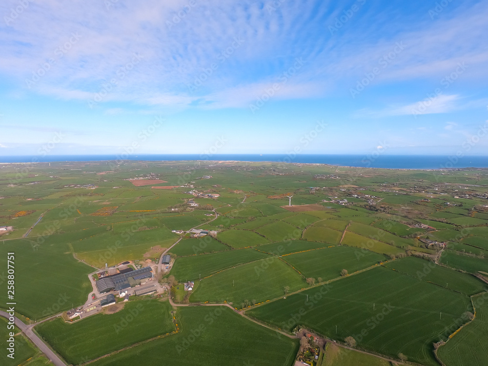 Aerial view of green fields and coast of Irish Sea in Northern Ireland. Coastal Route