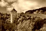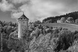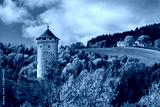 Old medieval castle tower on a hill in the forest in Europe on a bright sunny day