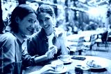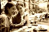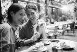 Cheerful young woman in casual shirts sitting at table and drinking coffee while gossiping about people in cafe