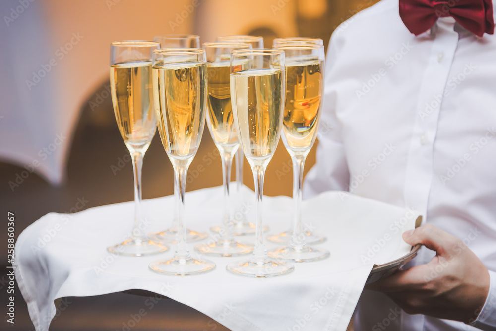 Waiter serving champagne glasses on a tray in a restaurant. Anniversary celebration concept.