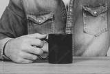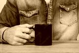 Hombre sosteniendo una taza de café. Vista de cerca y de frente