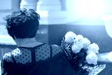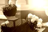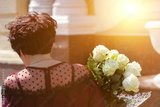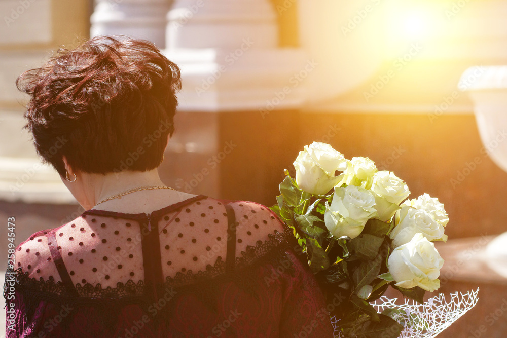 Beautiful girl holding bouquet of white roses flowers on dating in the city. Businesswoman with bunch of flowers. View from the back. Copy space