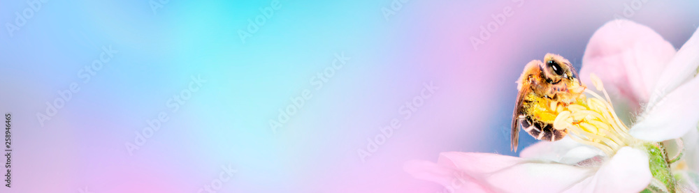 Pink spring background. Blooming tree flower with bee. Space for text. Spring summer border template floral background. Panoramic view