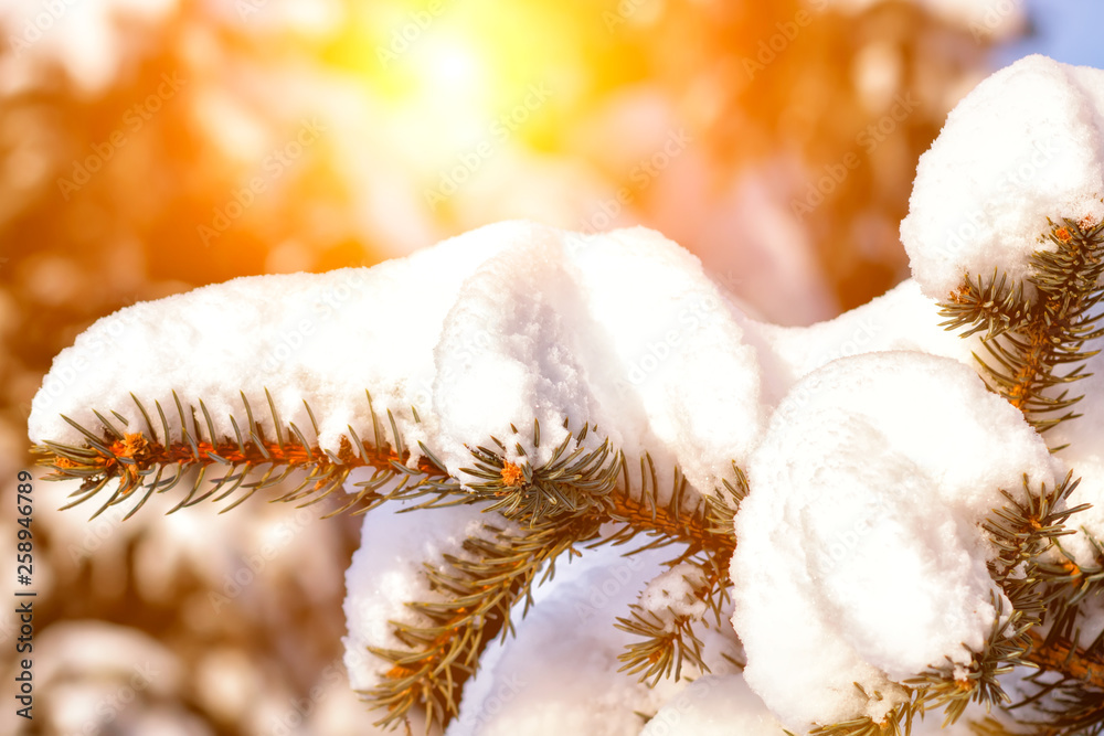 Frosty winter landscape in snowy forest. Pine branches covered with snow in cold winter weather. Christmas background with fir trees and blurred background of winter