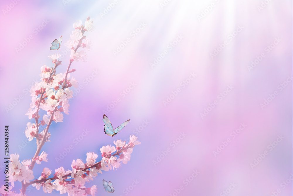 Beautiful cherry blossom springtime. Blossoming pink petals fruit tree branch, tender blurred bokeh background.