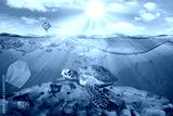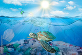 Plastic pollution in ocean environmental problem. Turtles can eat plastic bags mistaking them for jellyfish. dirty water concept