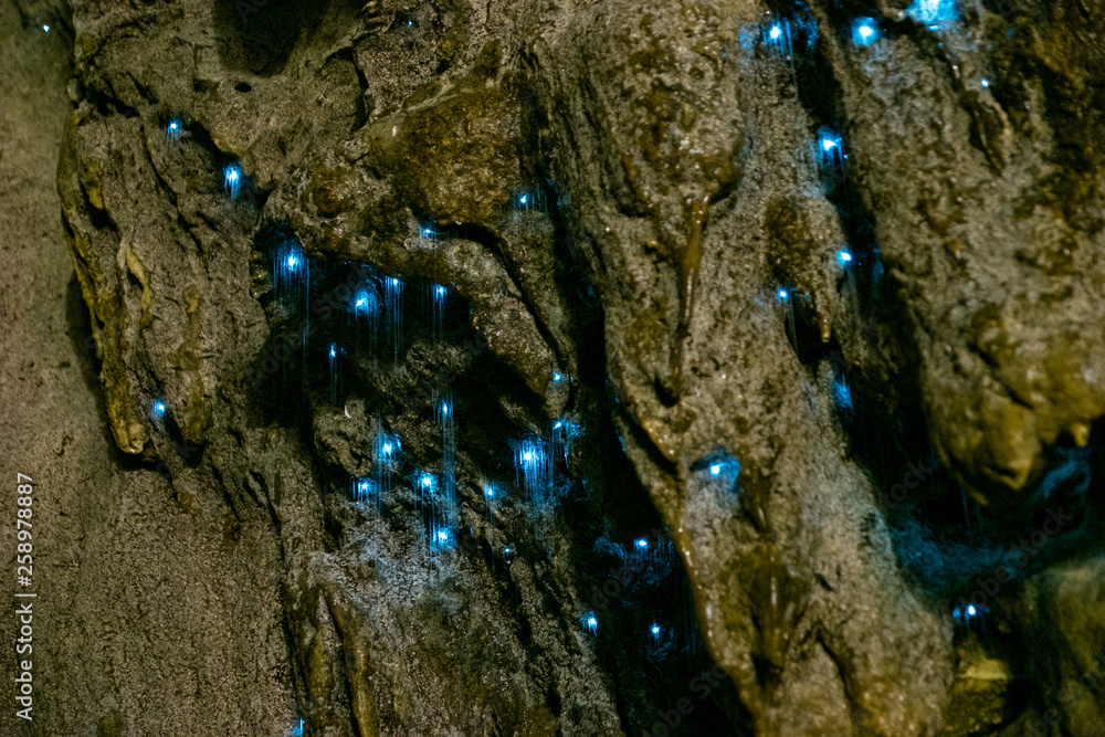 Amazing New Zealand Tourist attraction glowworm luminous worms in caves. High ISO Photo.
