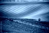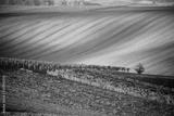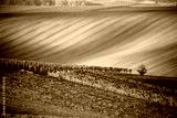 A lonely autumn tree against the background of the moravian fields and lines of autumn vineyards. Amazing autumn landscape of the Czech Tuscany South Moravia. Nature seasonal landscape.