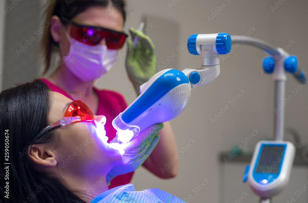 Close-up portrait of a female patient at dentist in the clinic. Teeth whitening procedure with ultraviolet light UV lamp.