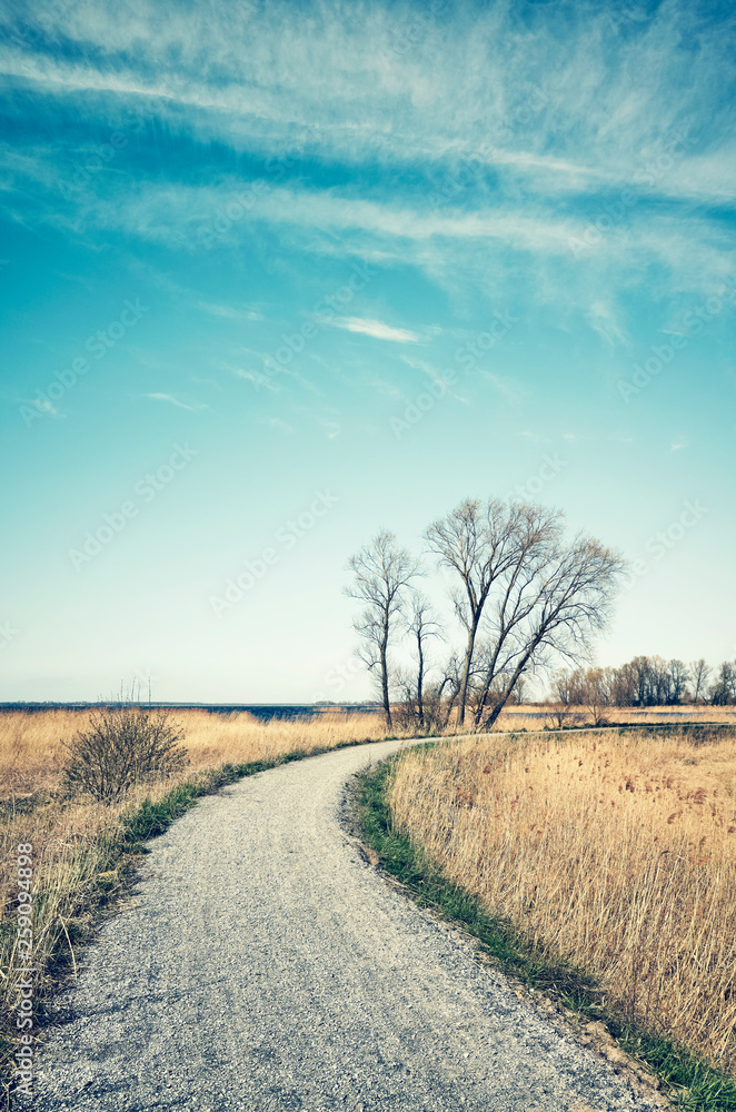 Color toned picture of a countryside road by a lake.