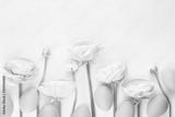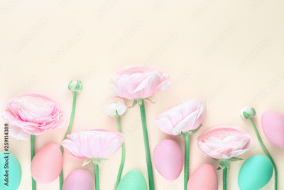 Tender pastel pink peony ranunculus flowers and dyed easter eggs flat lay with copy space. Happy celebration card
