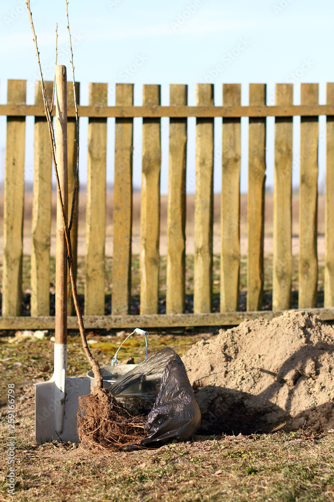 sapling of a cherry tree with an open root system, a shovel and a bucket with water. new fruit trees for the garden