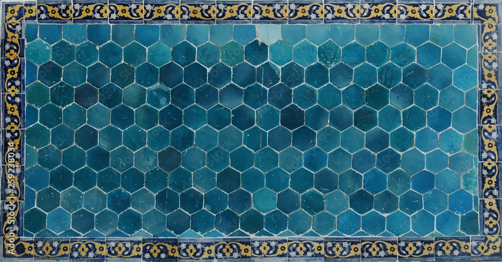 Ancient tile. Ceramic wall in Bukhara. Islamic ceramic decor.