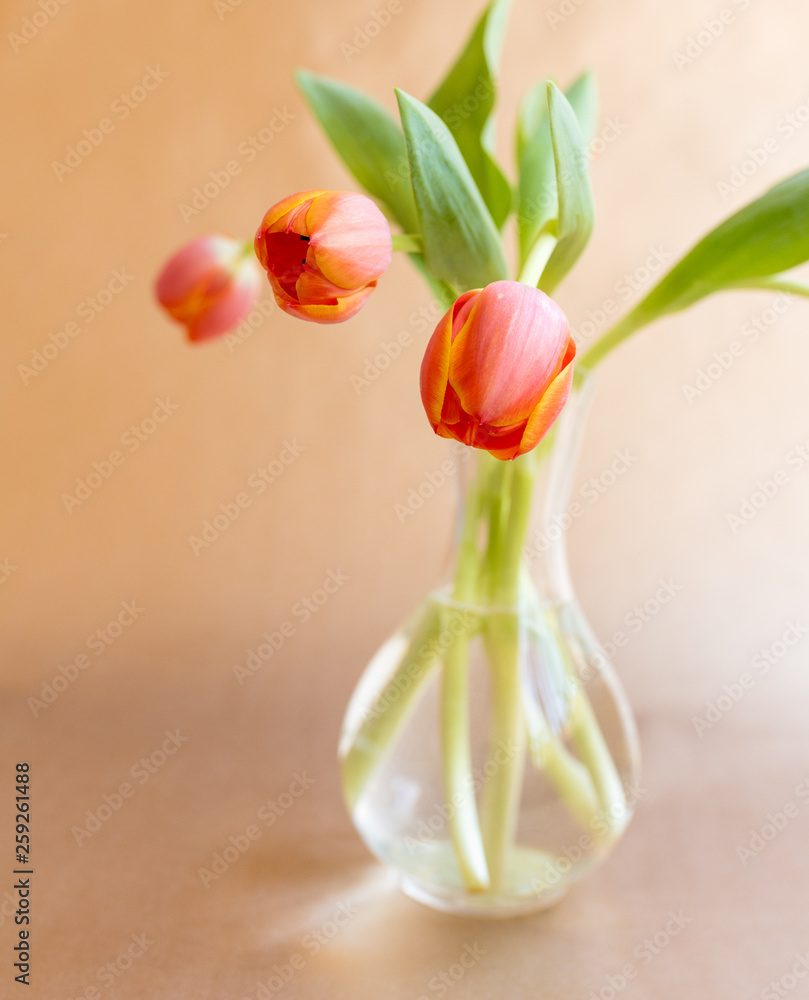 Closeup of orange tulip in glass vase against bronze background (selective focus)
