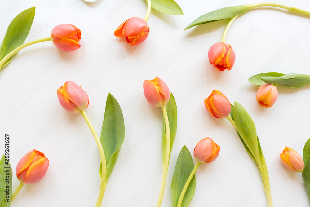 High angle view of orange tulips in abstract pattern gainst white background (selective focus)