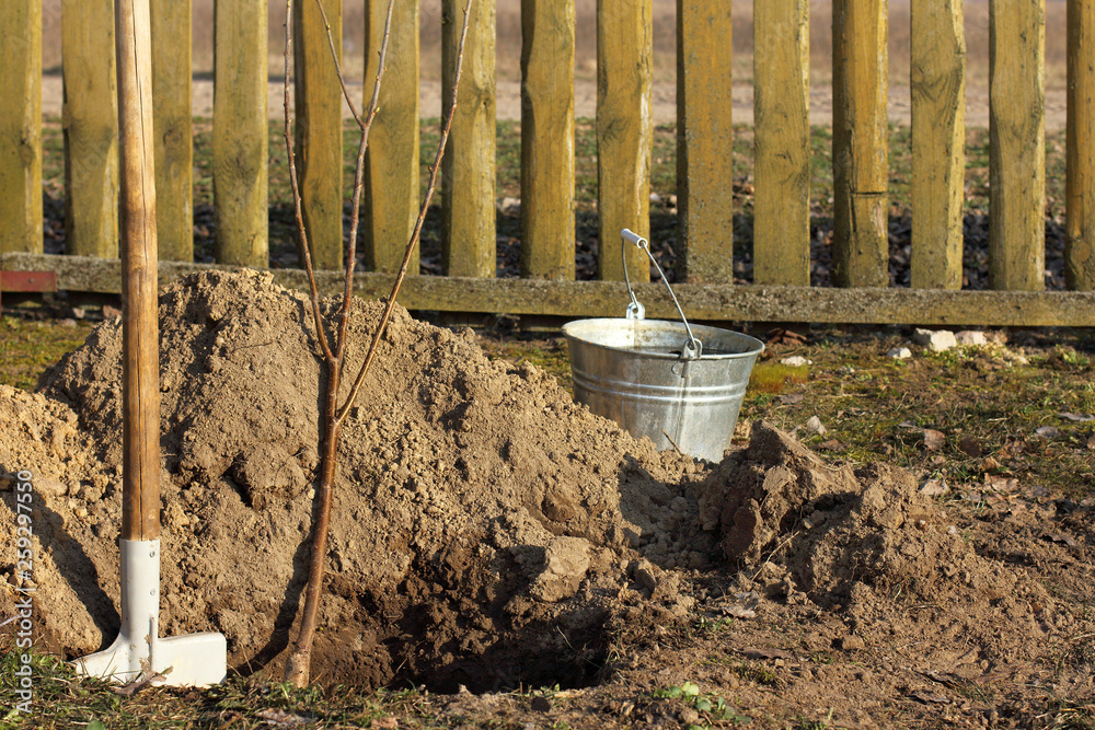 fruit tree seedling with shovel and bucket of water against the background of the fence in the spring garden. planting young cherry