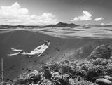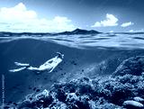 Woman swims around a coral reef surrounded by a multitude of fish on the background Islands..North Sulawesi, Indonesia.