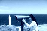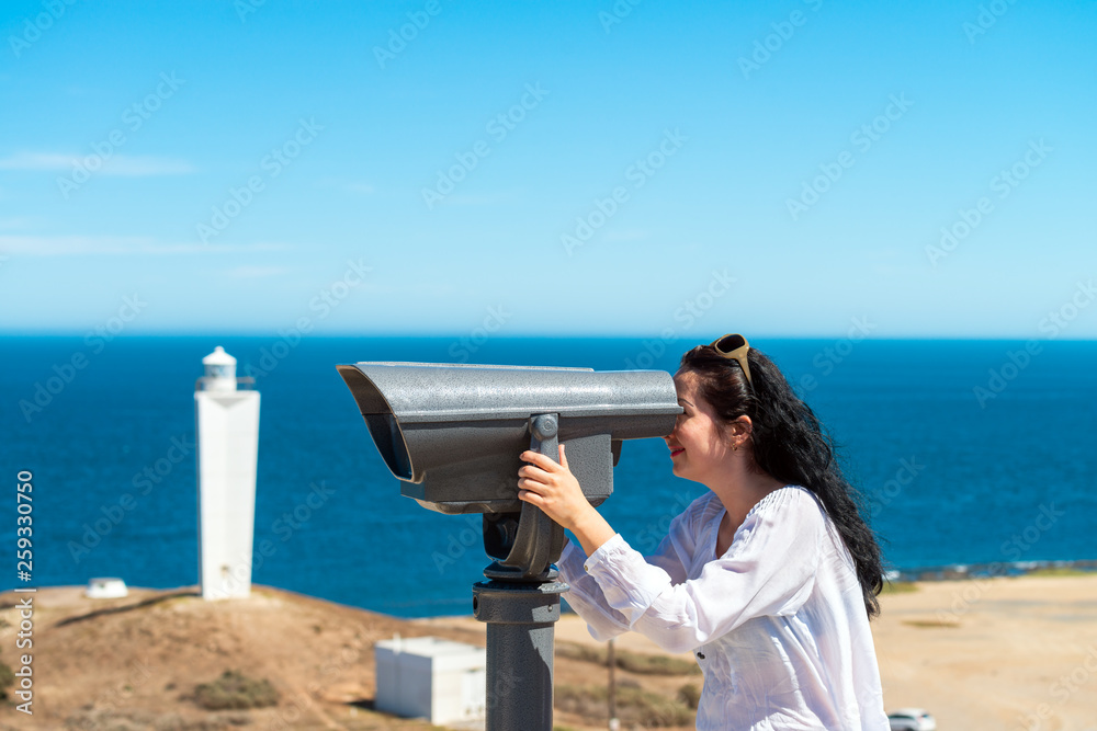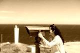 Pretty young woman observing Kangaroo Island coast scenery through outdoor binocular from Cape Jervis, South Australia.