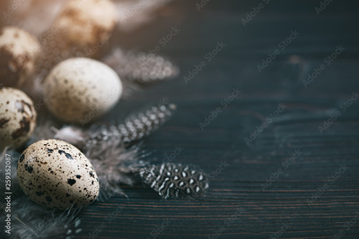 Quail eggs on old wooden background. Happy Easter. Top view. Free copy space. Selective focus.