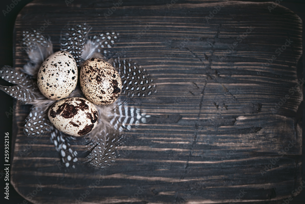 Quail eggs on old wooden background. Happy Easter. Top view. Free copy space. Selective focus.