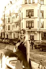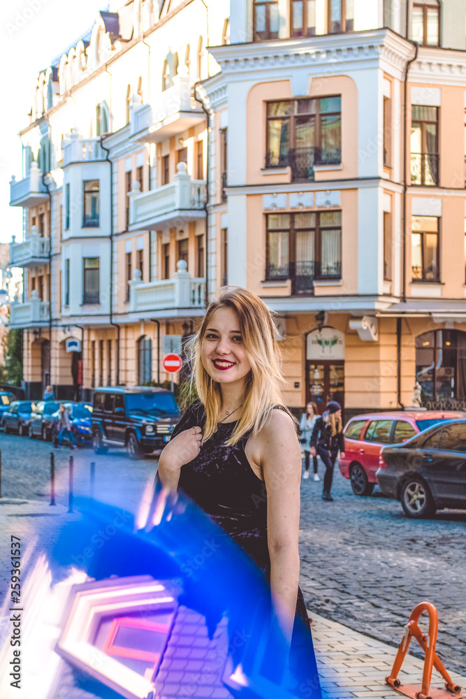 The young girl in black clothes in spring sunny day walks on old city streets. Dress and coat. Modern fashion. Patches of light.