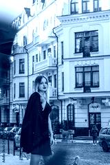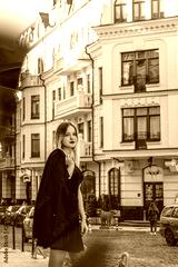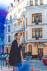 The young girl in black clothes in spring sunny day walks on old city streets. Dress and coat. Modern fashion. Patches of light.