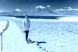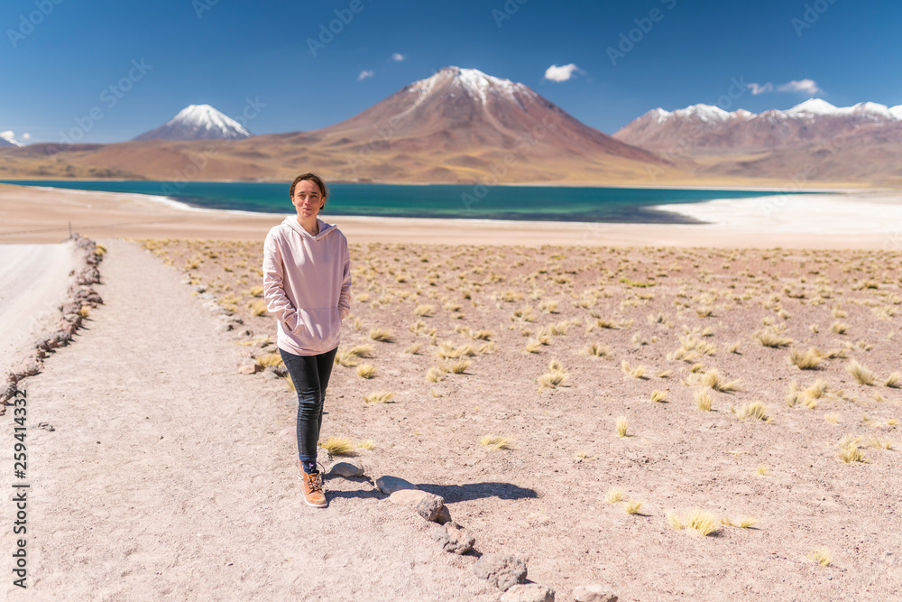 Women hiker looking at views in an amazing wilderness environment at Atacama Desert Andes mountains lagoons at Lagunas Altiplanicas. A woman cut out silhouette over the awe Andean Altiplano scenery