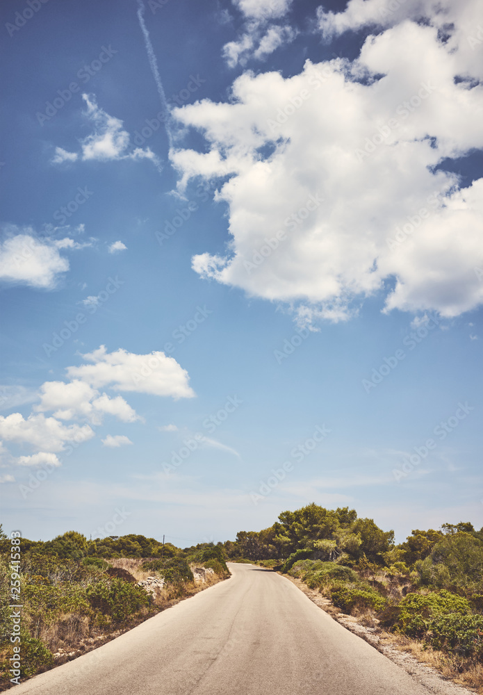 Countryside asphalt road on Mallorca, color toning applied, Spain.
