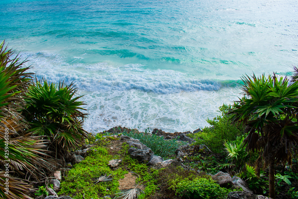 Beautiful landscape, coast of Caribbean Sea against blue Sky. Crystal Clear blue water in Tulum, Mexico