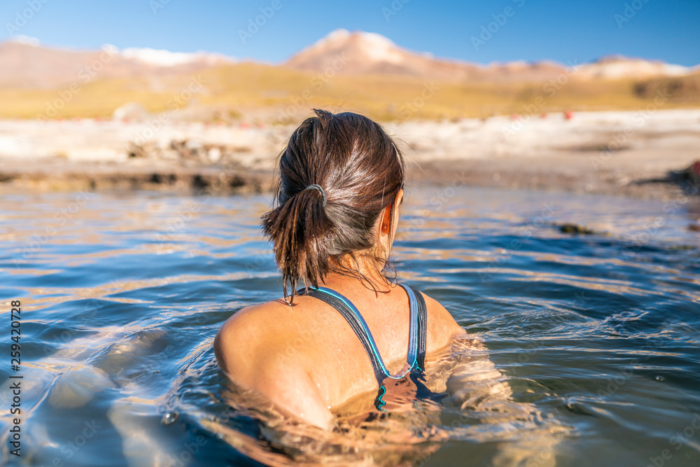 Woman taking a bath at El Tatio Geysers hot springs at Atacama desert, amazing thermal spring waters at 4500 masl inside Andes mountains scenic a place with an awe geothermal activity below the ground