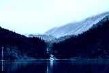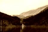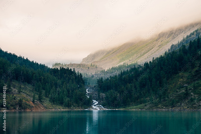 Ghostly forest near mountain lake in early morning. Mountain creek flows into lake. Ripple on smooth water surface. Low clouds. Dark calm atmospheric misty woodland landscape. Tranquil atmosphere.