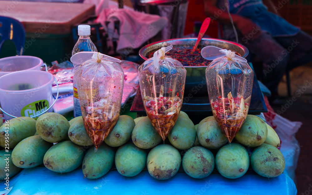 SAKON NAKHON, THAILAND FEBRUARY 2, 2019 - Fresh green mango on sale at the market, Sakon Nakhon, Thailand