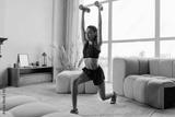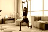 Sportswoman lunging forward with blue barbells at home