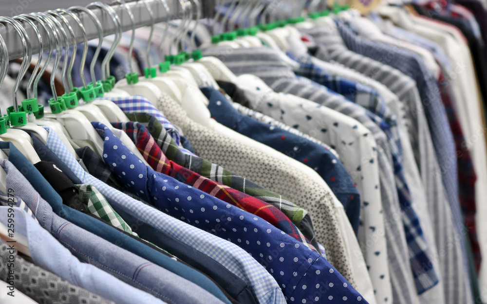 Elegant shirts on hangers in the store blurred. On the eve of Black Friday. Background for design from a department store.