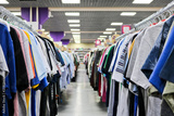 Knitted T-shirts hanging in two rows on hangers in the store blurred. On the eve of Black Friday. Background for design from a department store.