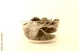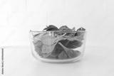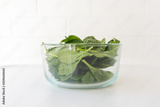 Close up of baby spinach leaves in glass bowl on white table (selective focus)