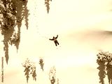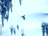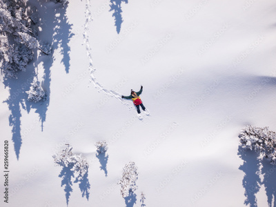 Winter aerial view portrait of Snowboarder female lying in clean snow between Christmas trees. Snowy mountain in ski resort, sunny winter holiday
