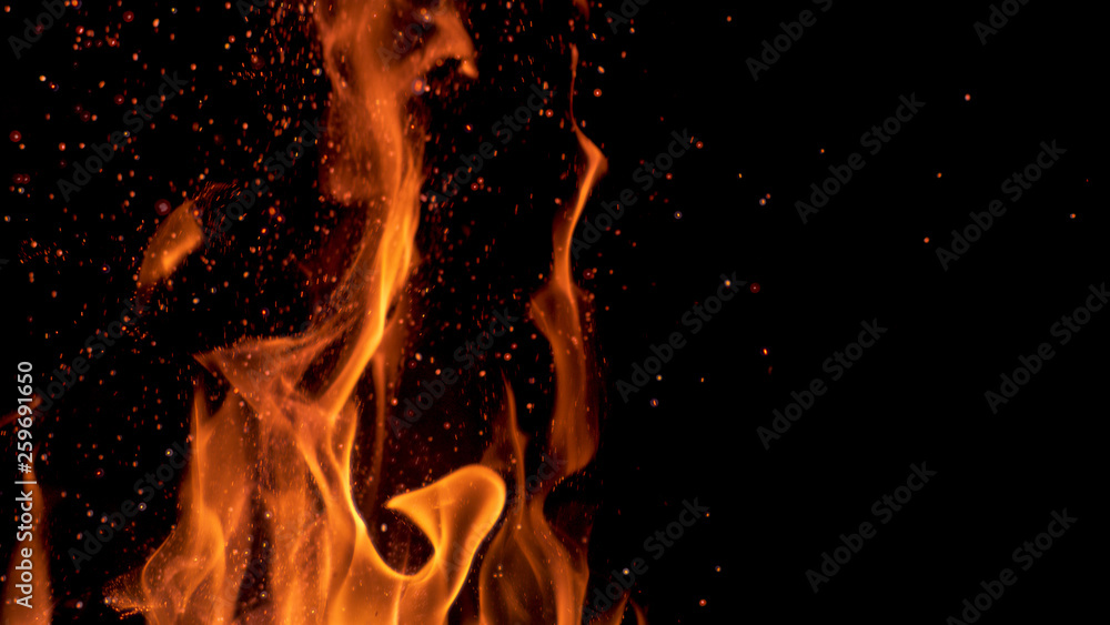 MACRO: Colorful flames flickering and sparks come flying out of a bonfire.