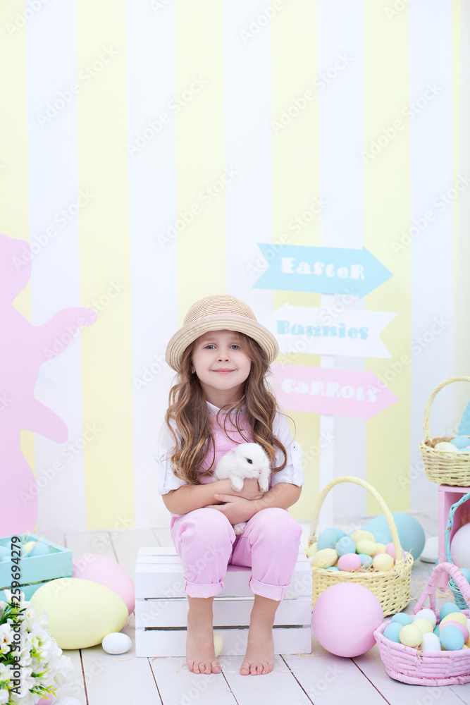 Easter! A girl is playing with the Easter bunny. A child holds a rabbit in his arms against the background of the Easter interior. Easter colorful decor in the studio, a basket of colorful eggs.