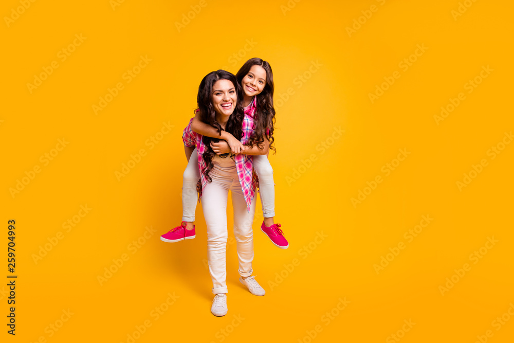 Full length body size photo of mom kid best fellows fellowship have free time feeling careless weekend holidays laughter fooling dressed in colorful trendy clothing isolated on vivid background