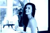 Beautiful young woman applying cosmetics onto her healthy long hair at home