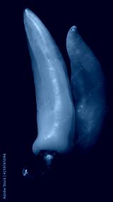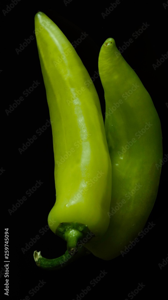 Two fresh green peppers on a black background