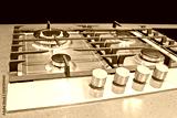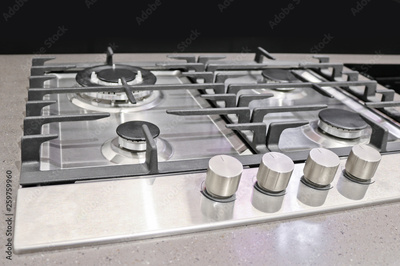 New modern gas stove with four burners for the kitchen, stainless steel surface, cast iron grates